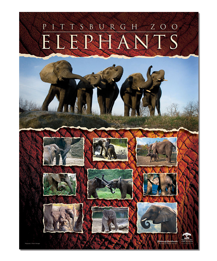 Poster featuring the elephants of The Pittsburgh Zoo & PPG Aquarium handed out for free at the zoo with the purchase of a Pittsburgh Post-Gazette in order to boost Post-Gazette single-copy sales. Size: 18" x 24"