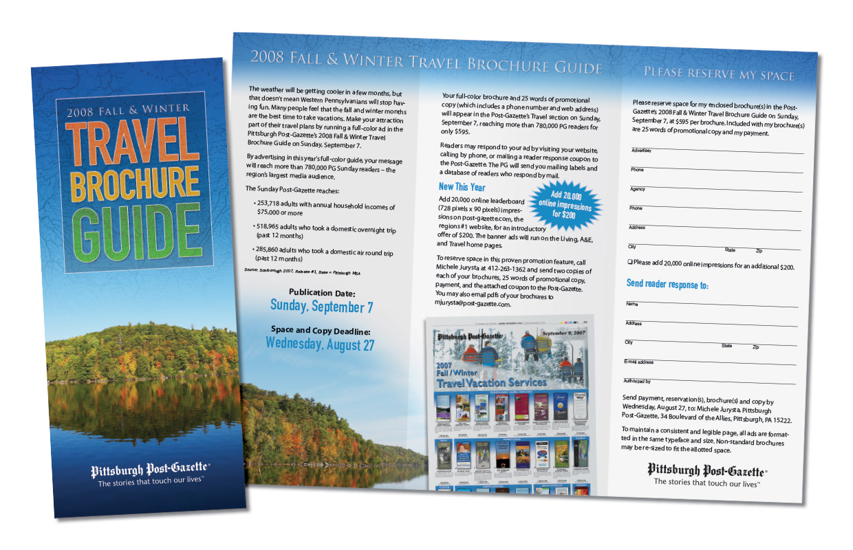 Tri-fold flyer promoting advertising in the Pittsburgh Post-Gazette's Travel Brochure Guide. Size: 3.6875" x 8.5" (folded), 11" x 8.5" (opened).